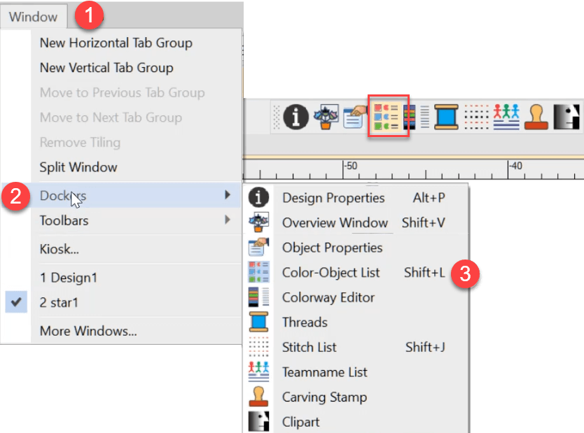 The Color Object List shows the color blocks, individual objects, tool icon, stitch type and count.