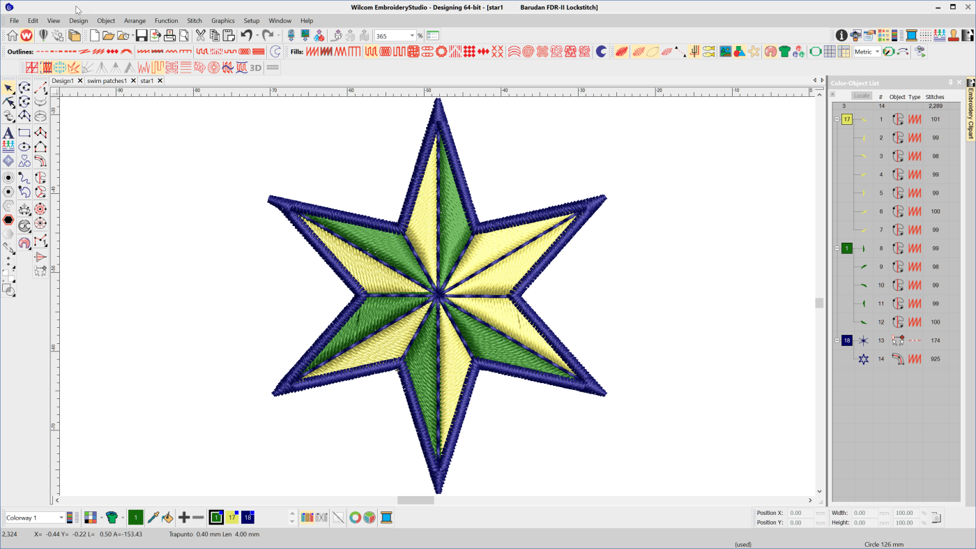 At a glance I can see in this design the first 12 objects have been created with the Complex Fill tool and the stitch type is satin.