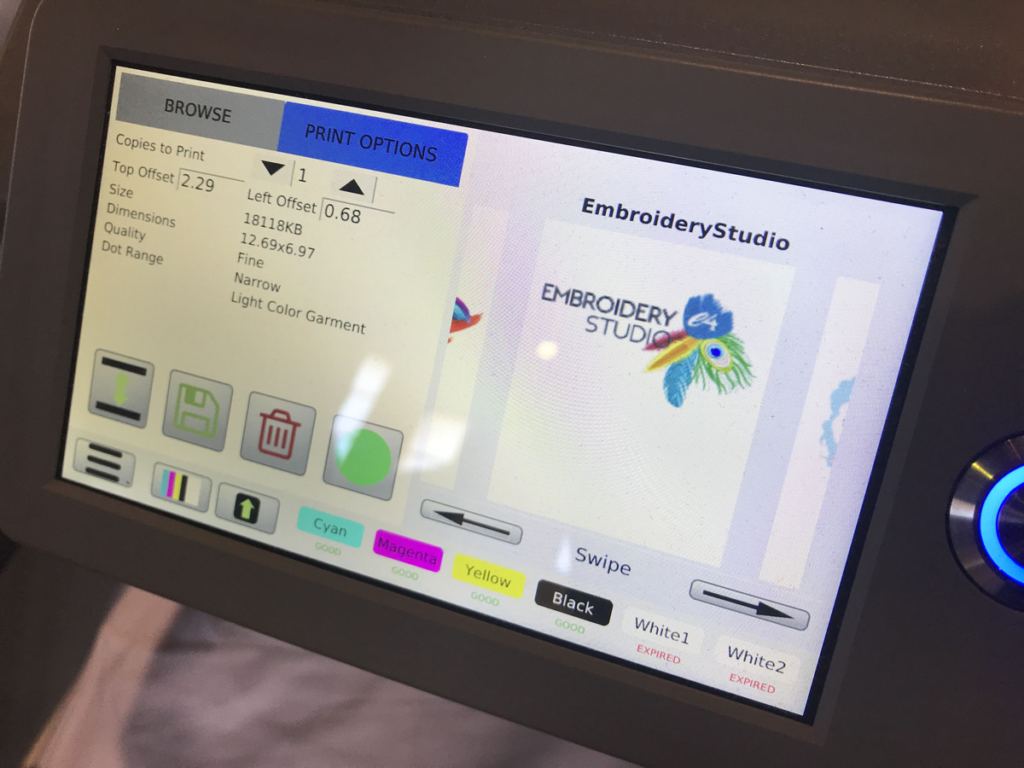 Wilcom’s EmbroideryStudio has a feature called Capture Virtual Decoration Bitmap which allows you to create a high-resolution printable file of the embroidery design, which is perfect to print on a Direct to Garment printing machine.