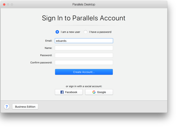 Before launching for the first time you will be prompted to sign in or register an account with Parallels: