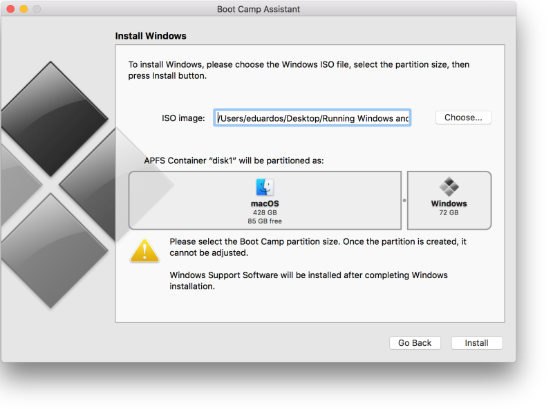 On the ‘Install Windows’ screen please choose the Windows ISO file that you previously downloaded from the Microsoft site, and the decided how much space you are going to spare for the Windows partition. Please be aware that once you have made this decision, will be very difficult to change it, most probably you will require an technician to do it for you.
