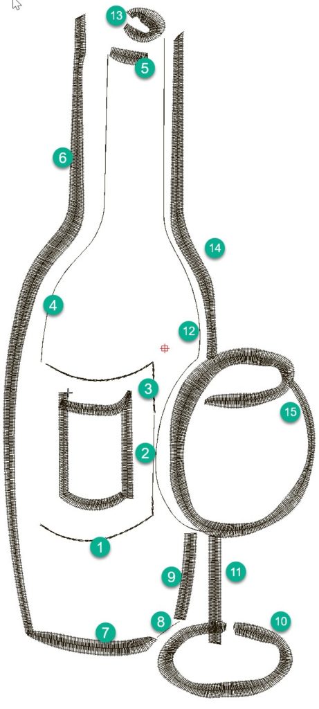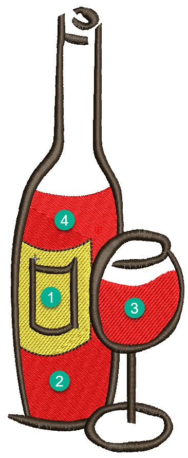 The yellow label and red wine are larger areas of fill and most suited to the Complex Fill Tool and Tatami Fill Stitch Type. The red areas are separate objects allowing for a different stitch angle on the glass to the top and bottom of the bottle. So the stitch order is the:
