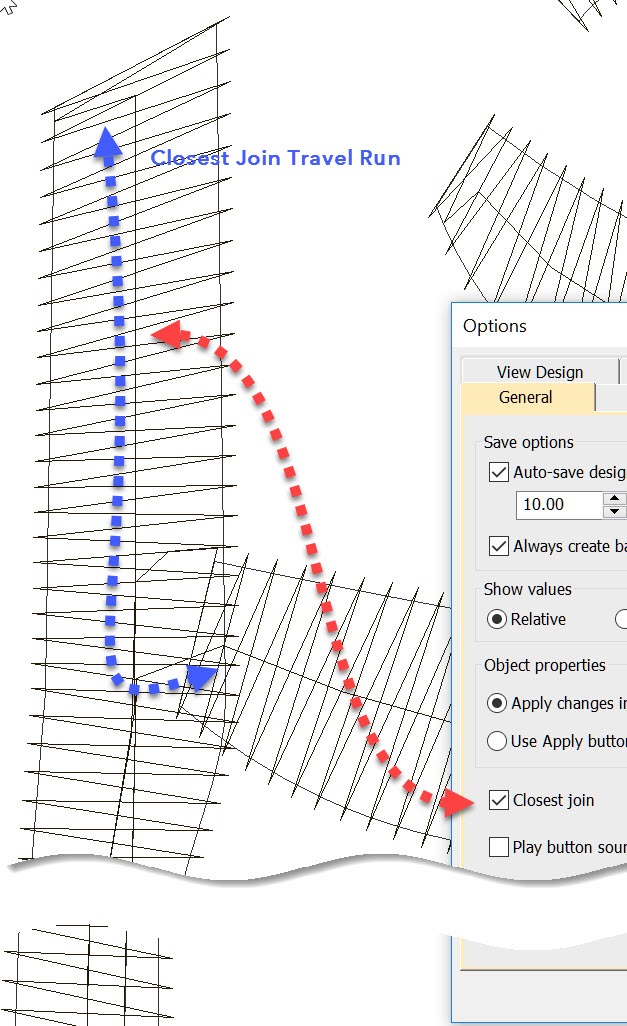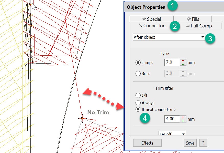 In this example you will notice (in the video) the gap between objects 3 and 4 is greater than the connector value and a thread trim is created. The solution is to adjust the thread trim setting upward, in this case from 2 mm to 4mm.