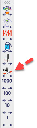 The quickest way to identify thread trims in a design is to travel through the design by left or right clicking on the scissor icon in the Travel Toolbar.