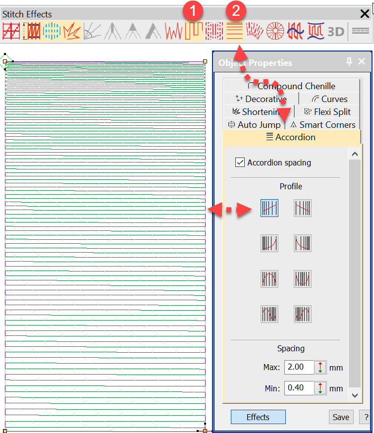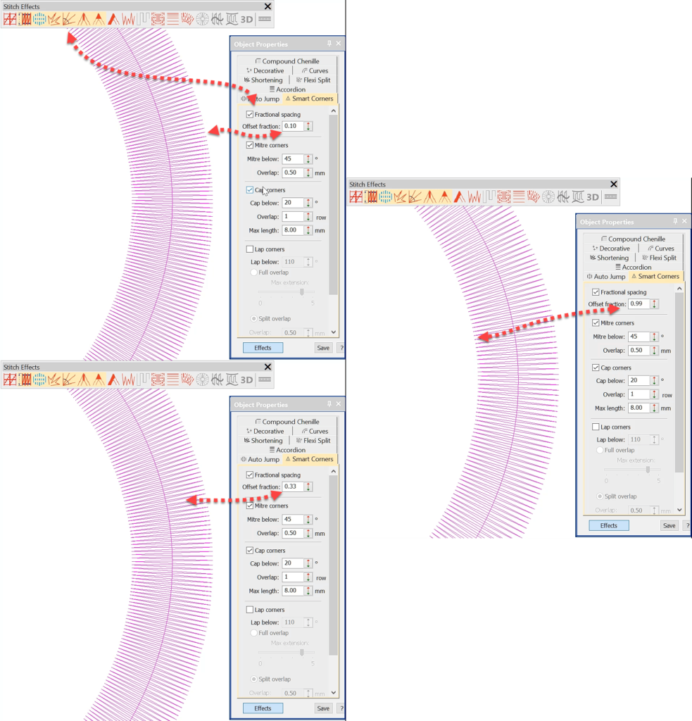 Stitch Spacing is a critical property for good design and may vary from one fabric to another and one object to another.