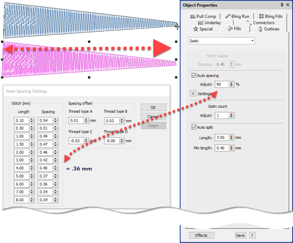 Spacing in Satin columns is treated slightly differently and allows for stitch spacing based on the width of the column of stitching. We call this Auto Spacing, the settings may be adjusted in the Settings tab.