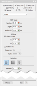 To adjust the stitch spacing in Tatami fill go to the Fills tab in the Object Properties dialog.