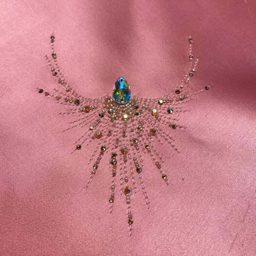 Source Facebook (@PaulTazewellDesign)“A sneak peek into some embroidery studies for Glinda. I had the extreme pleasure of working with some of the most amazing craftspeople for @wickedmovie. This particular study for Glinda’s was meticulously cared for by @bbembriodery @hattiemcgillembriodery @twanlentjescreations. We often created many pieces to decide which way to go. Which beads, sequins, studs etc. to apply, which to change, which to add more….. for me the process was very exciting getting to know these artisans and the expertise they brought to this project…”